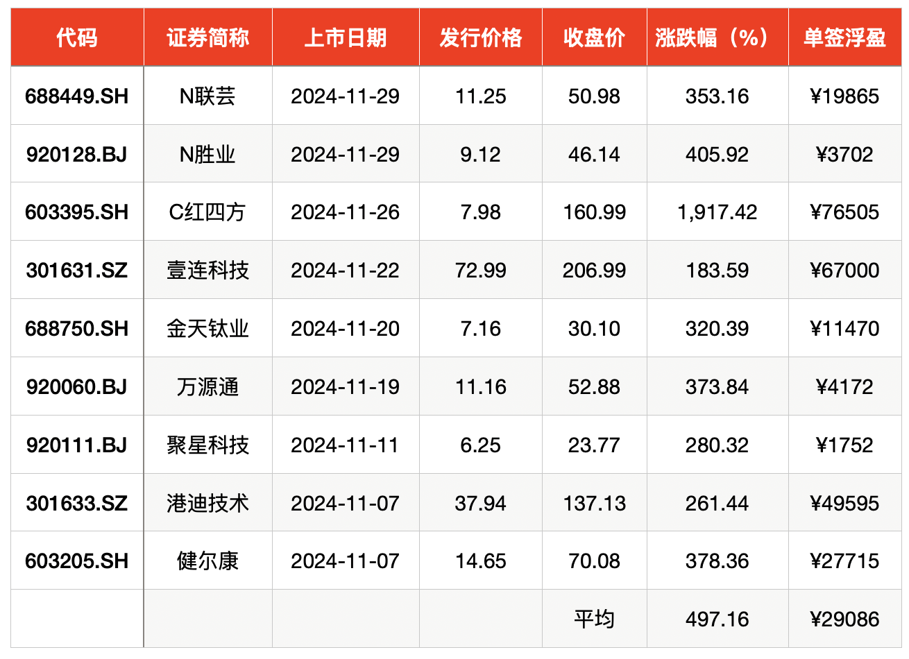 根据澎湃新闻统计,以上市首日收盘价计算,11月上市的9只新股,投资者平均中一签浮盈为29086元,上市首日平均涨幅为497.16%。